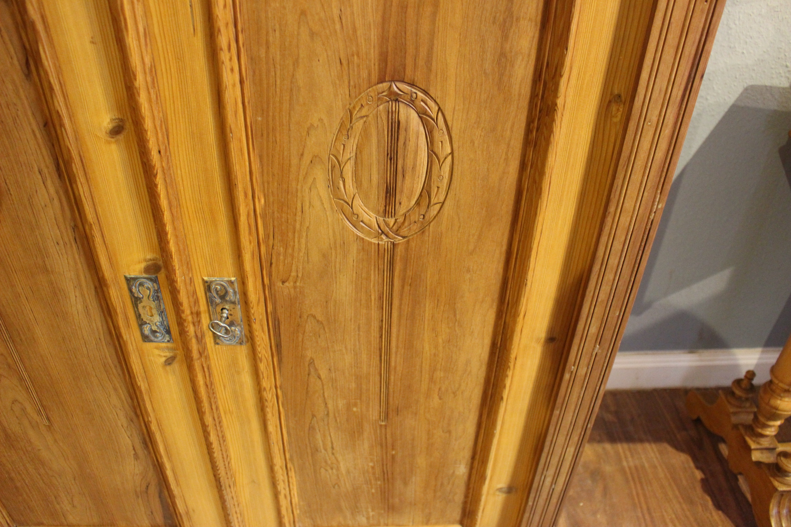 Zweitüriges Vertiko aus Kiefernholz, die Türfüllungen mit den geschnitzten Elementen sind aus Erle. Regale im Original vorhanden.