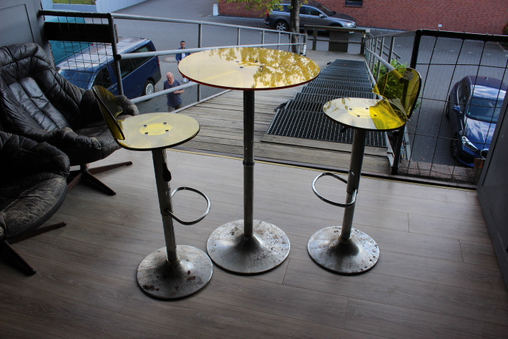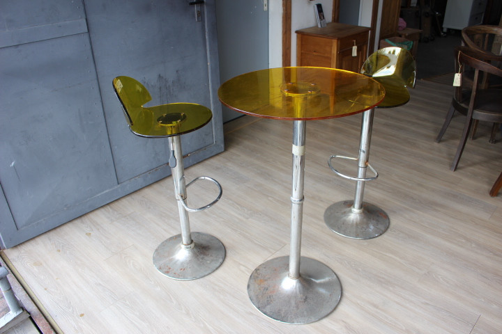 Tisch und Barhocker aus Acryl und gebürstetem Metal, teils vercromt
