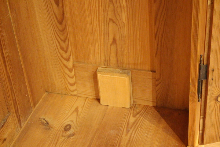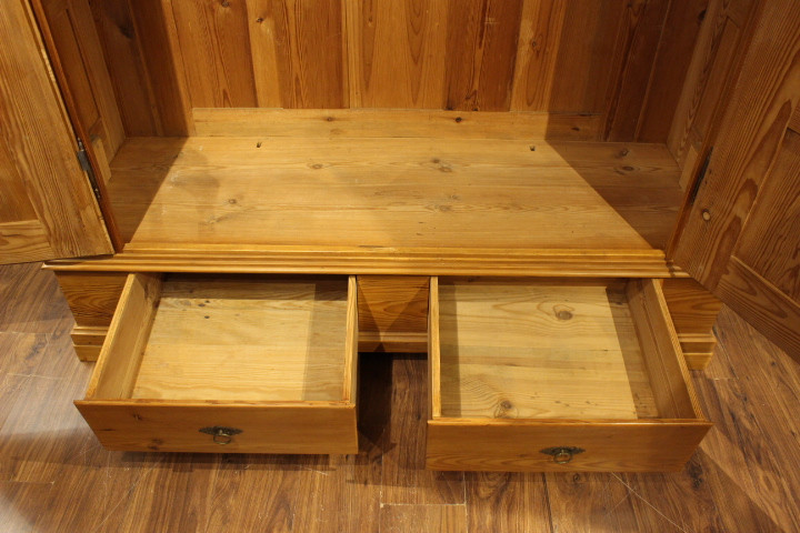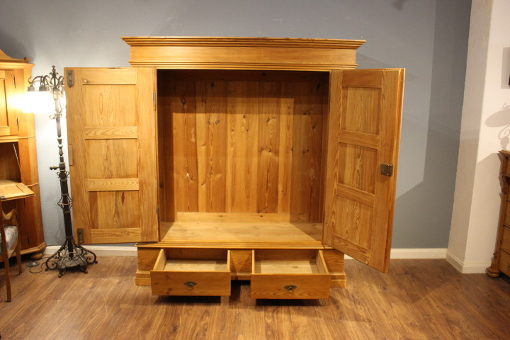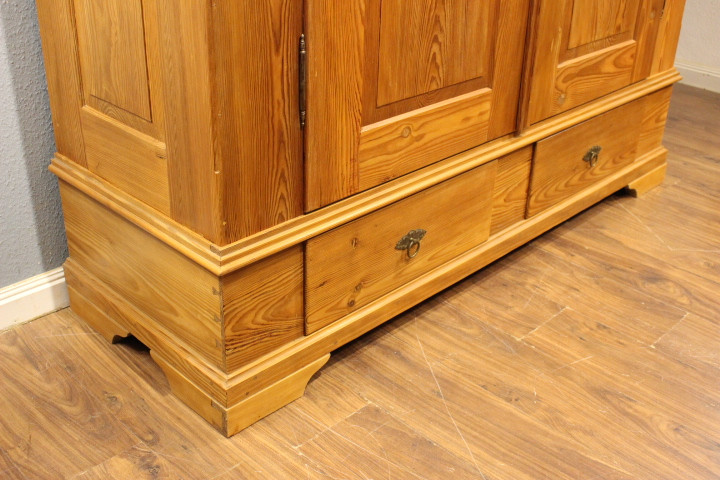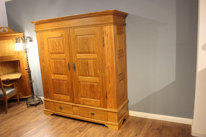 Dielenschrank Kiefer, zweitürig, zwei Schubladen, zerlegbar mit Kassettenfüllungen.