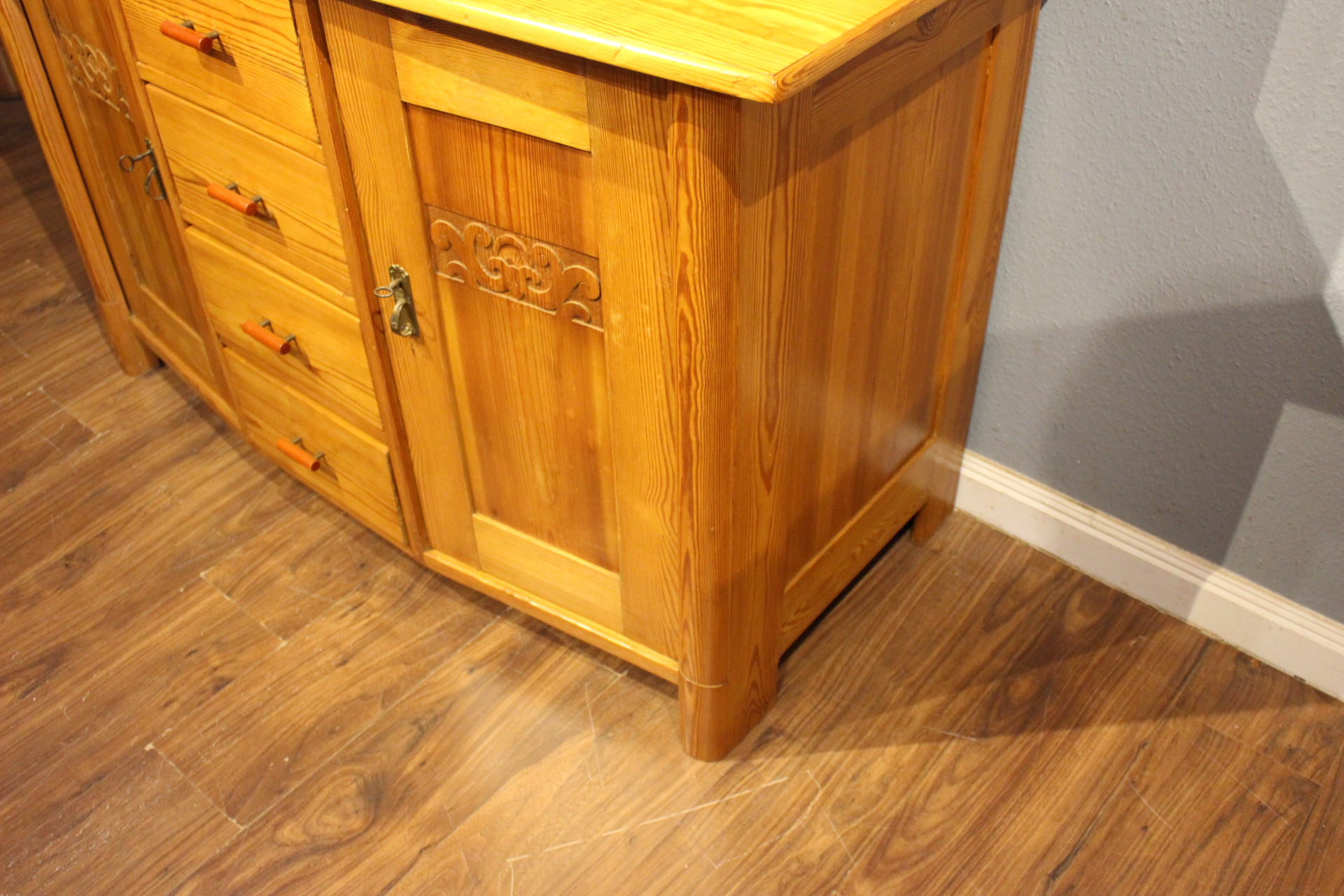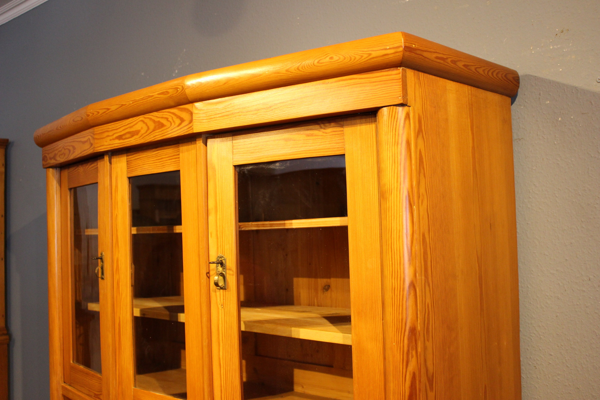 Küchenbuffet aus Kiefer mit drei Glastüren und einem Schubladenturm im Unterteil.