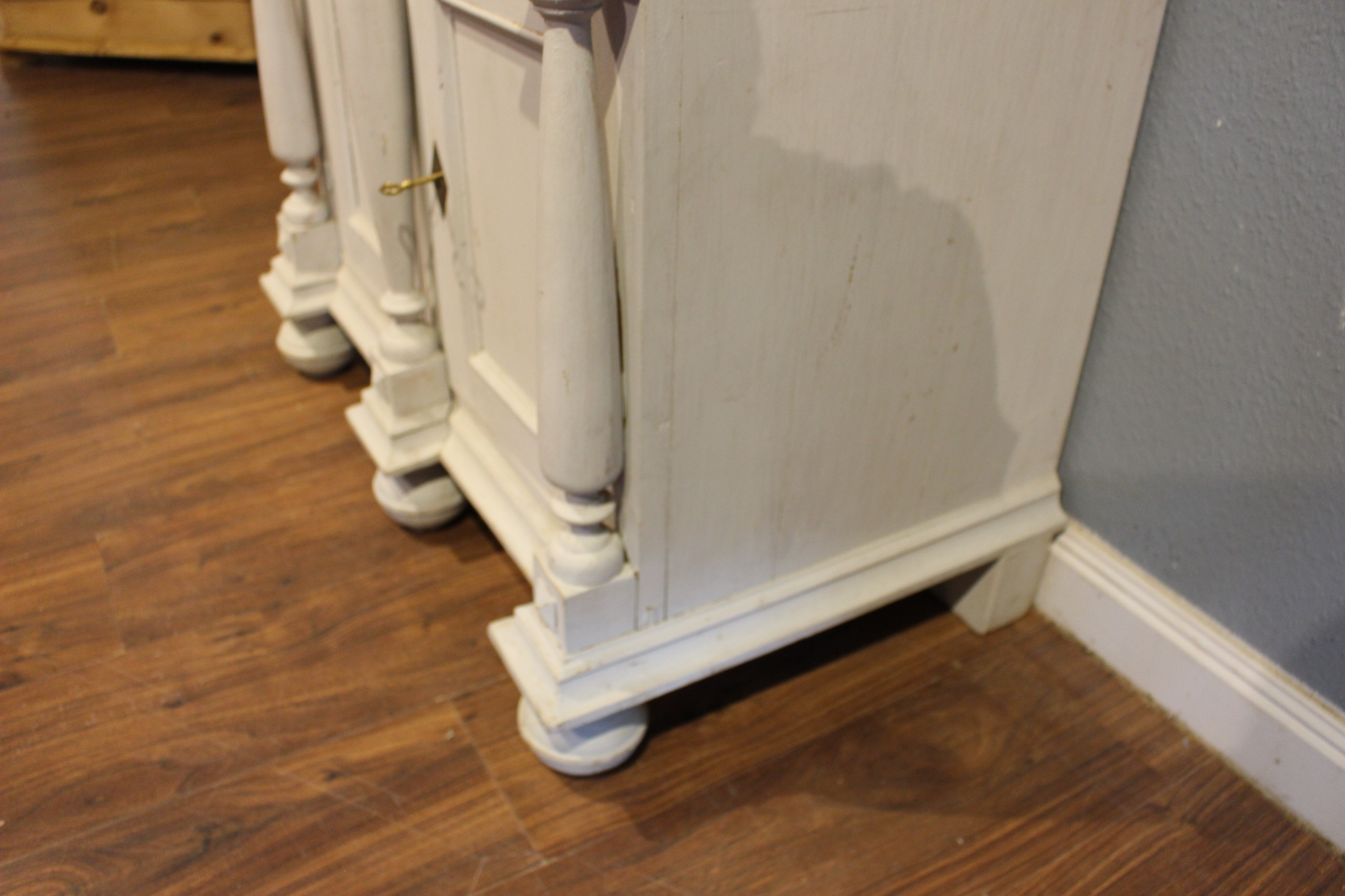 Weiß grundiertes kleines, schlankes Küchenbuffet, das noch weiter bearbeitet werden kann.