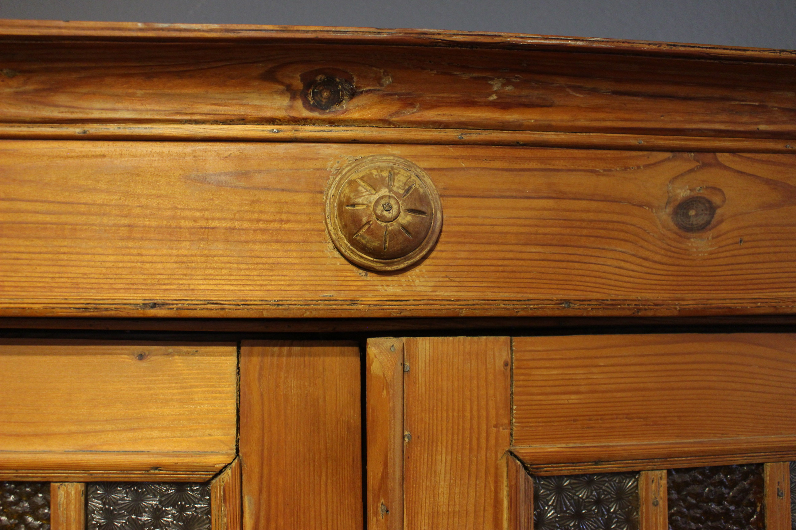 sehr typische Jugendstil-Vitrine mit floralen Applikationenan an den Seiten und buntem Glas in den Türen.